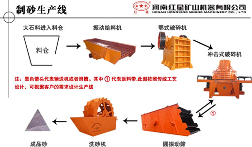 制砂生產(chǎn)線通常由振動給料機(jī)、顎式破碎機(jī)、直通沖擊式破碎機(jī)(制砂機(jī))、振動篩、洗砂機(jī)、膠帶輸送機(jī)、集中電控等設(shè)備組成,設(shè)計(jì)產(chǎn)量一般為50-500T/H,我公司經(jīng)歷數(shù)年的開發(fā)研究,將具有國際先進(jìn)水準(zhǔn)的直通沖擊式破碎機(jī)(制砂機(jī))與公司其他系列產(chǎn)品相配套,設(shè)計(jì)出全套的制砂生產(chǎn)線,處于行業(yè)的領(lǐng)先地位。